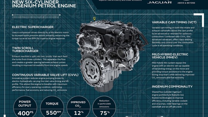 Компания Jaguar Land Rover переключается с V6 на рядный шестицилиндровый бензиновый двигатель. Ранее такая конфигурация уже использовалась на классических E-type и XJ-S. Новый 3,0-литровый бензиновый агрегат с турбонаддувом будет дополнительно оснащен 48-вольтовой гибридной технологией.